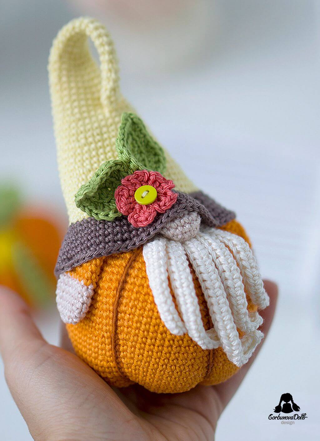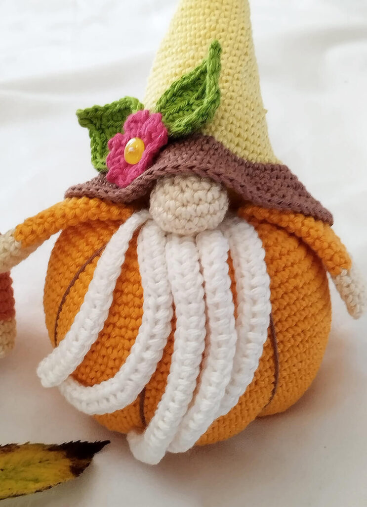 - Construction: The Halloween gnome’s body is a pumpkin, and the arms, beard, nose, and hat are sewn onto it.